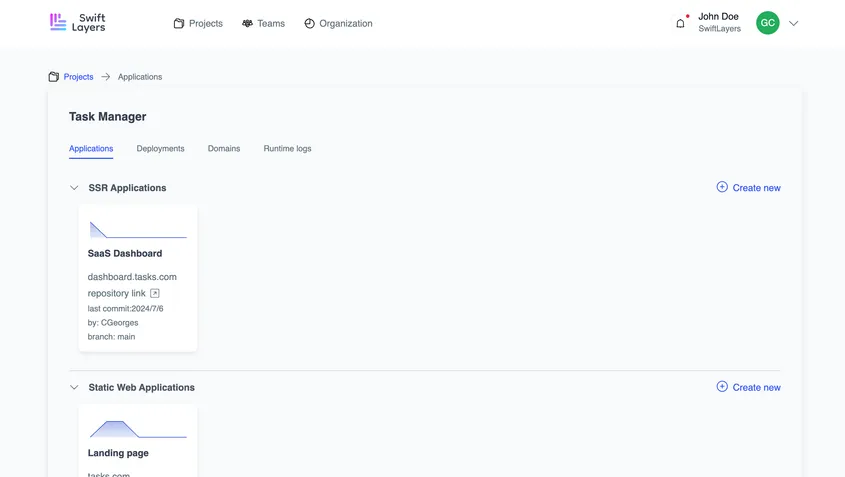 Swiftlayers detects your tech stack and builds your application. No complex configs, no pipelines, no hassle.